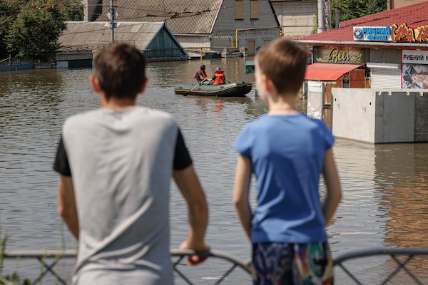 Children from the Korabel neighbourhood watch a rescue operation in their community after a massive flood caused by destruction of the Nova Kakhovka dam, on June 7.Anton Skyba/The Globe and Mail