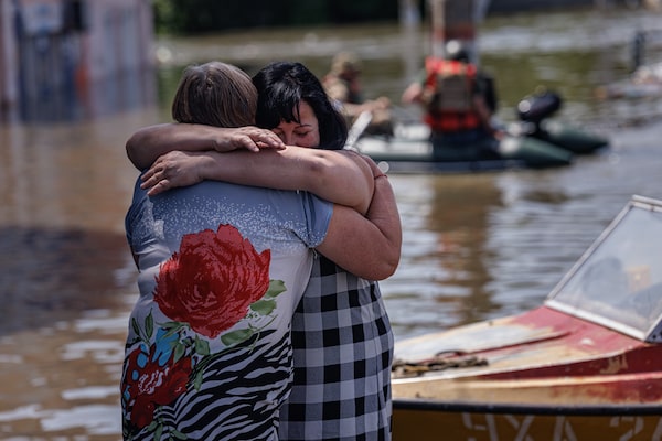 Neighbors of Korabel district hug each other in Kherson, Ukraine, after being rescued from the massive flooding on June 7.Anton Skyba/The Globe and Mail