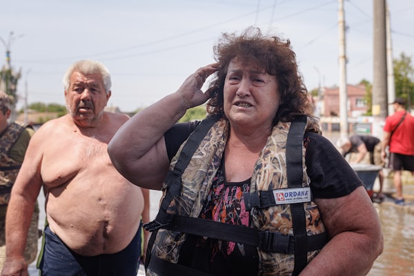 Brown water continued to fill Korabelna Square throughout Wednesday. A line of dark red bricks on one of the buildings framing the square was a half-metre above the waterline at 10 a.m. when The Globe and Mail arrived in Kherson, but had disappeared from sight five hours later. A trunk of someone’s belongings floated through the submerged square as small boats and big-wheeled Sherp amphibious rescue vehicles continued to hunt for those trapped in their homes.
