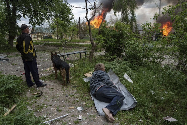 A man lies on the ground as he watches his burning house destroyed by a Russian airstrike in Vovchansk, Ukraine, on May 11.Evgeniy Maloletka/The Associated Press