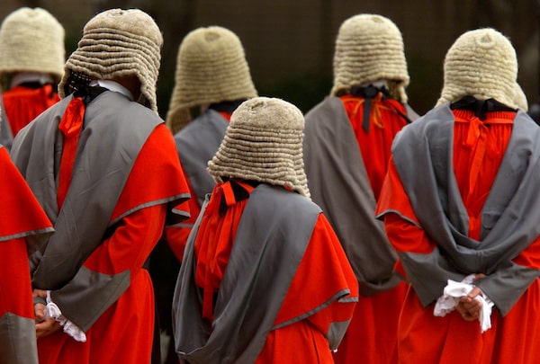 Supreme Court judges wearing wigs attend a ceremony to mark the beginning of the new legal year in Hong Kong on Jan. 14, 2002.Reuters Photographer/Reuters