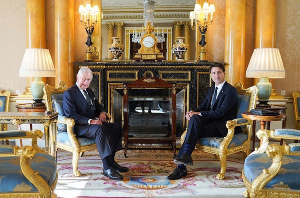 Britain's King Charles III sits with Prime Minister Justin Trudeau, as he receives realm prime ministers in the 1844 Room at Buckingham Palace in London on Sept. 17, 2022.STEFAN ROUSSEAU/AFP/Getty Images