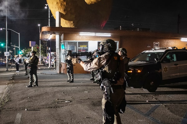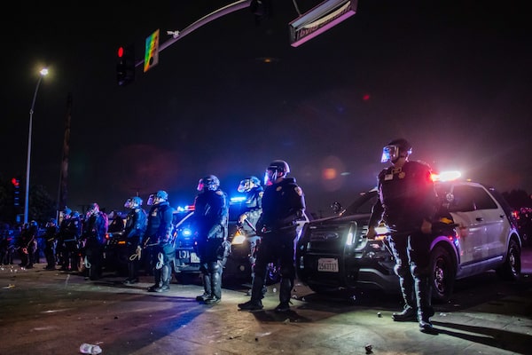 California Highway Patrol officers wearing tactical gear face off against protesters south of downtown Los Angeles on Saturday.Apu Gomes/Getty Images