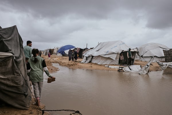 Palestinians walk through a flooded area in a temporary tent camp after heavy rainfall in Gaza City on March 26.Jehad Alshrafi/The Associated Press