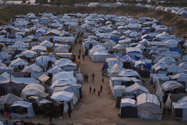 Palestinians walk along tents at a makeshift camp for displaced people in Khan Younis on Thursday.Abdel Kareem Hana/The Associated Press