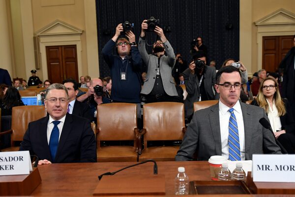 Kurt Volker, left, former U.S. special envoy to Ukraine, and Tim Morrison, a former official at the National Security Council, testified before the House Intelligence Committee on Nov. 19, 2019.Susan Walsh/The Associated Press