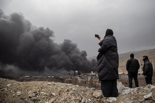 Plumes of smoke rise over oil depot tanks hit by joint Israel-U.S. strikes overnight north west of Tehran on Sunday.Hossein Esmaeili/The Globe and Mail
