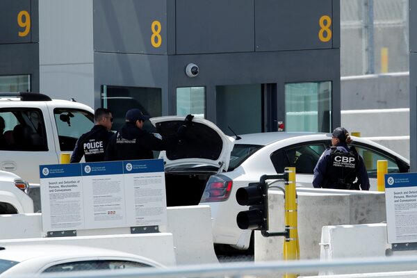 U.S. federal agents inspect vehicles leaving the United States at the U.S.-Mexico border after U.S. President Donald Trump tweeted that he will be signing an Executive Order to temporarily suspend immigration into the United States during the COVID-19 outbreak in San Diego, California, on April 21, 2020.MIKE BLAKE/Reuters