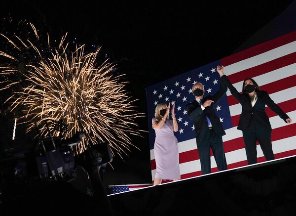From left: Jill Biden, Joe Biden and Kamala Harris outside the Chase Center in Wilmington, Delaware, at the conclusion of the Democratic National Convention, Aug. 20, 2020.OLIVIER DOULIERY/AFP/Getty Images