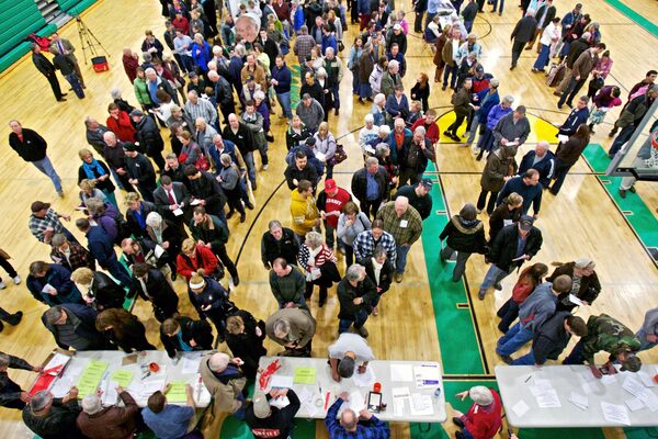 Registered Republican voters stand in line March 6, 2012, for the caucus event in Rathdrum, Idaho. Idaho Republicans will gather in presidential caucuses this Saturday, March 2, 2024, to help pick their party's presidential standard-bearer.Jerome A Pollos/The Associated Press
