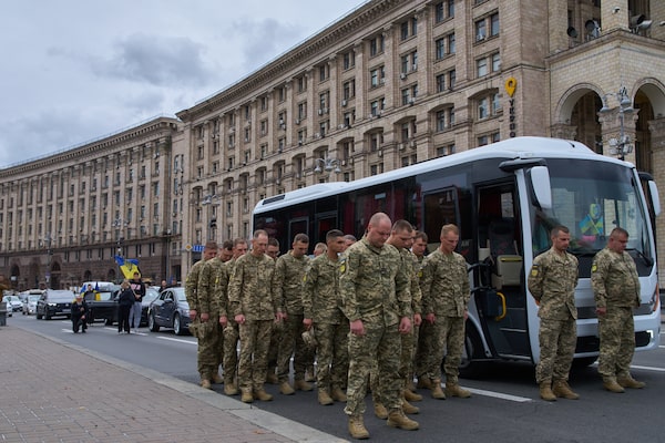 Ukrainian servicemen in Kyiv pay respect to a soldier who was killed in the Russia-Ukraine war as a hearse with his body drives through the city on Wednesday.Efrem Lukatsky/The Associated Press