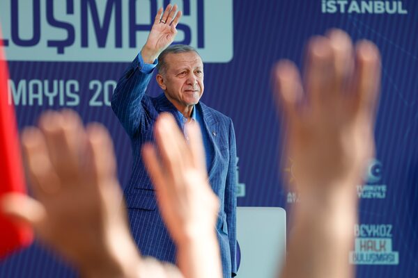Turkey's President Recep Tayyip Erdogan waves as he speaks at his final election campaign rally of the second round of the election campaign on May 27, 2023, in Istanbul.Jeff J Mitchell/Getty Images