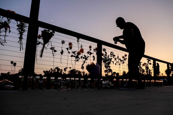 Orlando Aldana lights candles at a makeshift memorial near Truth Aquatics as the search continues for those missing in a pre-dawn fire that sank a commercial diving boat off a Southern California island near Santa Barbara.KYLE GRILLOT/Reuters