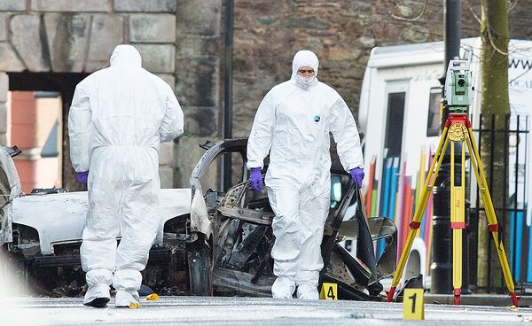 Forensic officers work at the scene in the aftermath of a suspected car bomb explosion in Londonderry, Northern Ireland, on Jan. 20, 2019.PAUL FAITH/AFP/Getty Images
