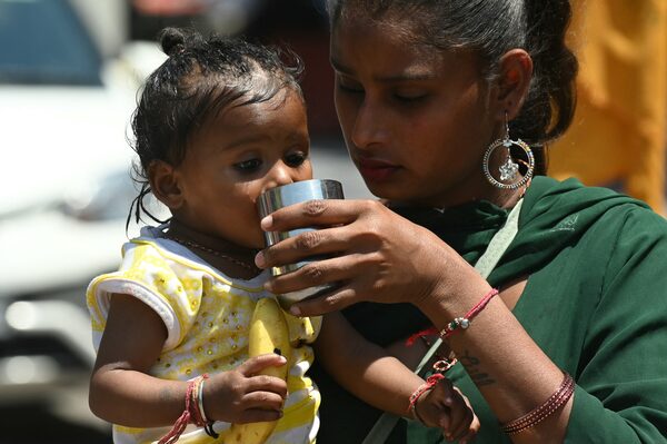 A mother helps her daughter to drink water during a hot summer day in Amritsar, India, on April 25.NARINDER NANU/Getty Images