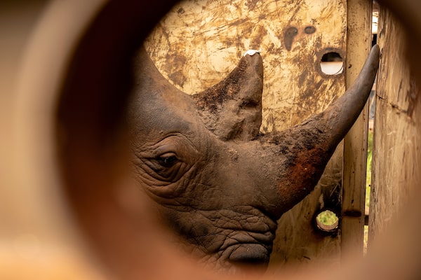 A rhinoceros stands inside the Ziwa Rhino Sanctuary as rangers prepare to relocate it to Kidepo Valley National Park.Moses Dipak/The Associated Press