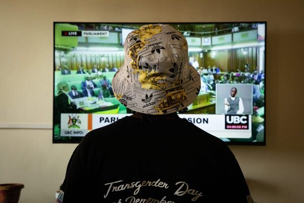 A Ugandan transgender woman who was recently attacked and currently being sheltered watches a TV screen showing the live broadcast of the session from the Parliament for the anti-gay bill, at a local charity supporting the LGBTQ Community near Kampala on March 21. Under the proposed law, anyone in the conservative East African nation who engages in same-sex activity or who identifies publicly as LGBTQ could face up to 10 years in prison.STUART TIBAWESWA/AFP/Getty Images