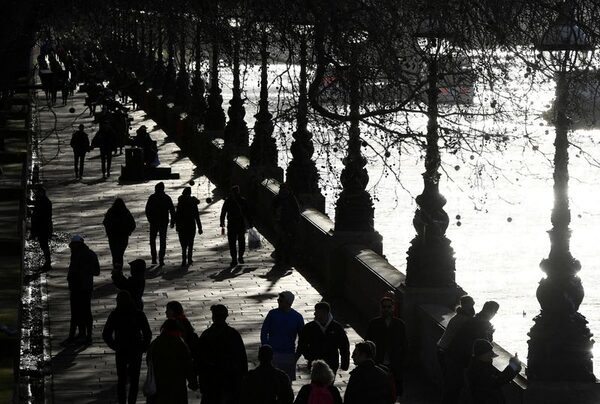 People view and walk beside the National Covid Memorial Wall, a dedication of thousands of hand-painted hearts and messages for those in the U.K. who have died from COVID-19, in London on Jan. 9.TOBY MELVILLE/Reuters