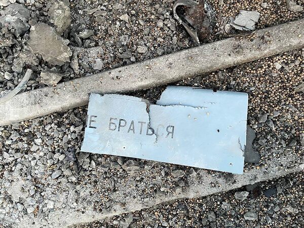 This handout photograph taken and released on Sept. 13 by the press center of the Defense Forces of Southern Ukraine shows what is alleged to be a fragment of a Russian drone following Russian drone attacks in Odesa region.Supplied/AFP/Getty Images