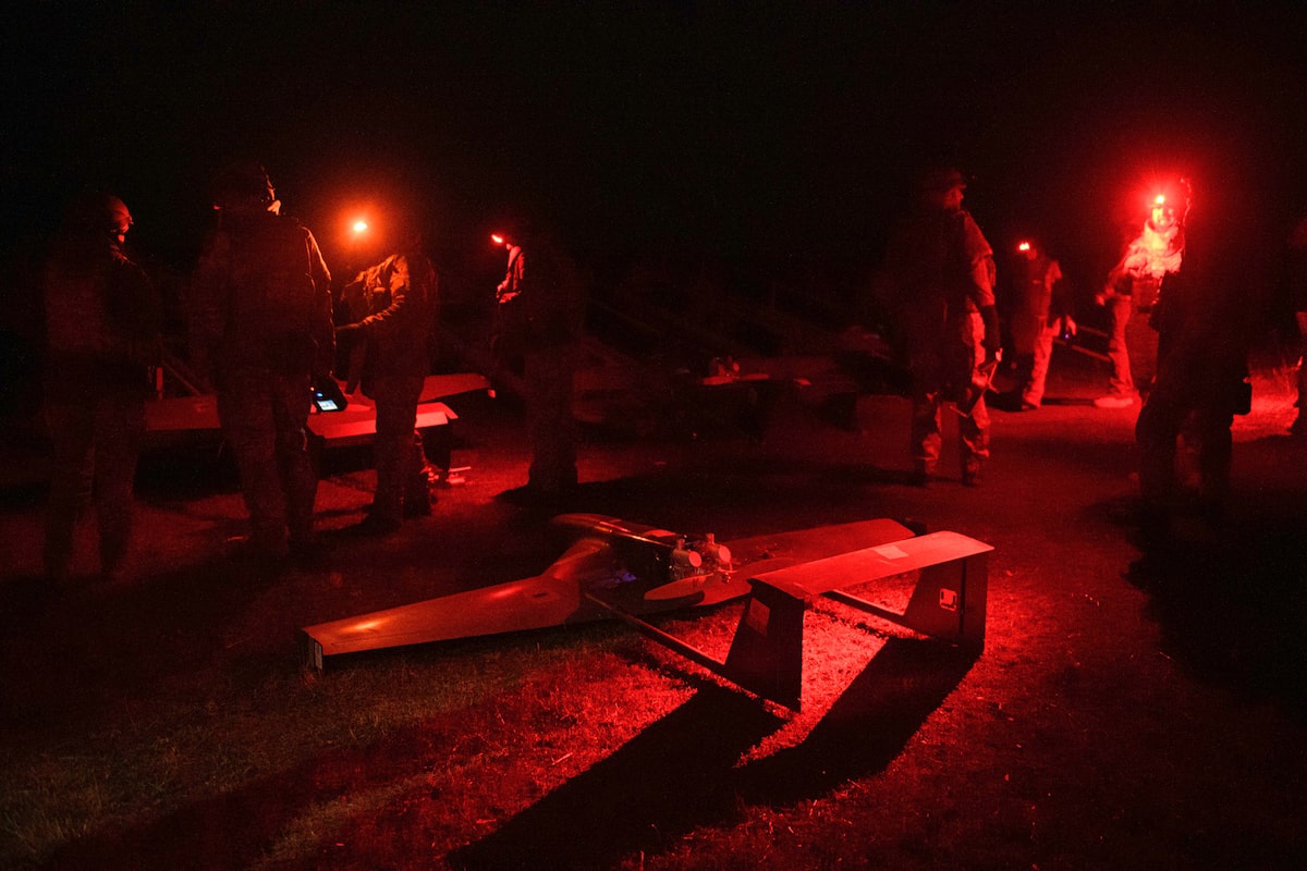 Moments later, there’s a cracking sound as the first launcher – which looks like a modernized version of a medieval trebuchet – fires a sleek black drone and its 15-kilogram payload north toward Russia, followed by the buzz of a jet propeller engine coming to life. The other six drones are launched in quick succession. “Bye-bye,” the commander, a veteran operative code-named Most, says with a laugh as the black silhouettes disappear one-by-one into the dark grey sky.