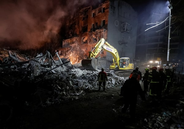 Rescuers work at the site of an apartment building hit by a Russian air strike, in Kharkiv, Ukraine, on Friday.Sofia Gatilova/Reuters