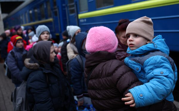 A group of children evacuated from an orphanage in Zaporizhzhia wait to board a train for their transfer to Poland after fleeing the ongoing Russian invasion at the main train station in Lviv, Ukraine, on March 5.KAI PFAFFENBACH/Reuters