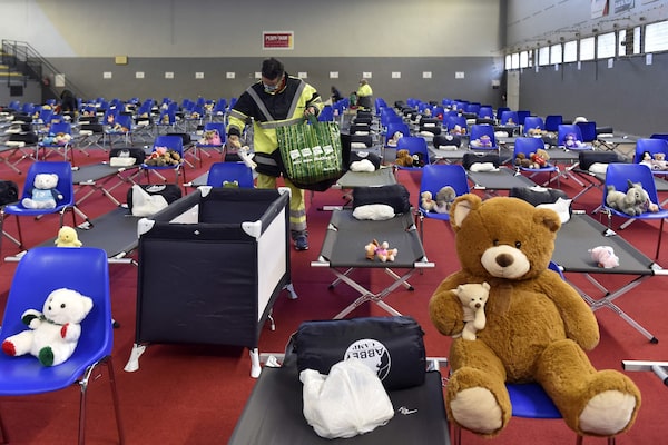 A municipality worker prepares a gymnasium to greet Ukrainian evacuees as they arrives in Perpignan, France on March 6.RAYMOND ROIG/AFP/Getty Images
