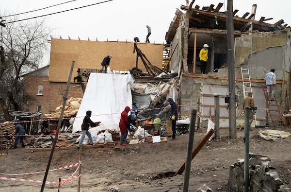 Volunteers help to reconstruct a house destroyed during a Russian attack on Dec. 31, 2022, before the start of the Orthodox Christmas, in Kyiv, Ukraine, Jan. 6, 2023.Roman Hrytsyna/The Associated Press
