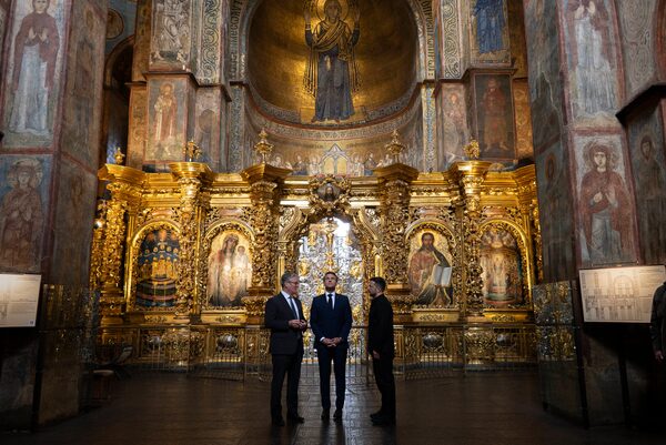 U.K. Prime Minister Keir Starmer, French President Emmanuel Macron and Ukrainian President Volodymyr Zelenskyy inside St. Sophia Cathedral on May 10.Mstyslav Chernov/The Associated Press