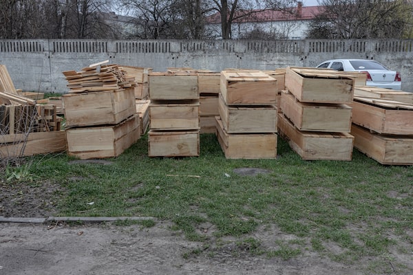 Above, one of the three refrigerator trucks used to store the bodies of victims after the overwhelmed morgue ran out of space. Below, rows of wooden coffins are stacked in the morgue's backyard.