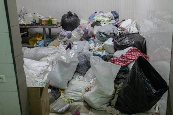 A room in the morgue is filled with the clothes and possessions of war casualties.
