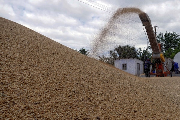 Workers storage grain at a terminal during barley harvesting in Odesa region, as Russia's attack on Ukraine continues on June 23, 2022.STRINGER/Reuters