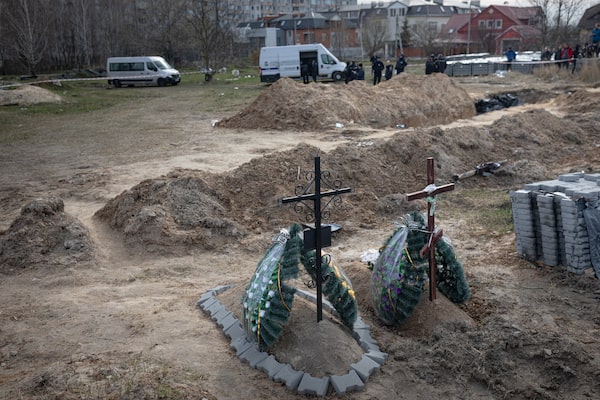 Mass grave on the territory of the Bucha Church is being excavated by police on April 8, 2022.ANTON SKYBA/The Globe and Mail