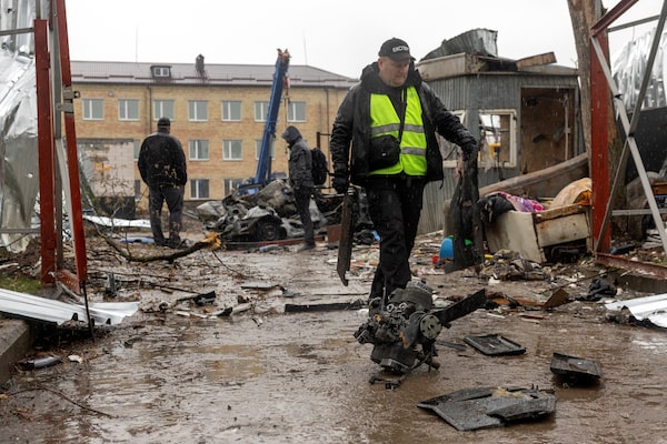 An investigator collects debris from a Russian drone in a residential neighbourhood outside Kyiv, Ukraine, after a daytime strike on Friday.Thomas Peter/Reuters