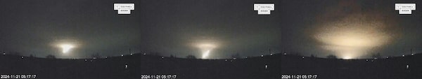 Video taken by national police and shared with The Globe and Mail showed a series of six white flashes over Dnipro just after 5 a.m. local time, followed by a pair of large explosions.
