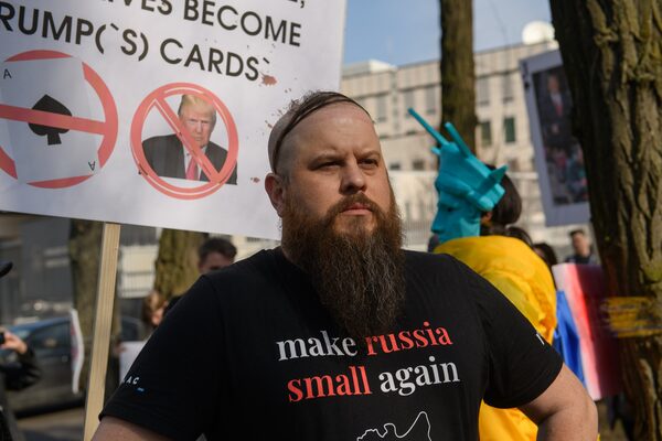 David Plaster, a former U.S. army medic who came to the country 13 years ago to fight alongside the Ukrainian army in 2014, joined the protest in Kyiv to express his anger at Mr. Trump's decision to suspend military assistance for Ukraine.Olga Ivashchenko/The Globe and Mail