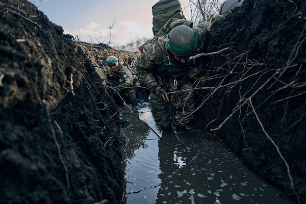 Ukrainian soldiers in a trench under Russian shelling on the frontline close to Bakhmut, Donetsk region, Ukraine, on March 5.LIBKOS/The Associated Press
