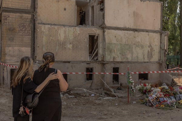 Women stand next to flowers, children's toys and portraits placed in memory of victims at the site of residential building destroyed following a Russian missile strike in Kyiv. Ukraine now has one of the world’s lowest birth rates and one of the highest death rates.ROMAN PILIPEY/AFP/Getty Images