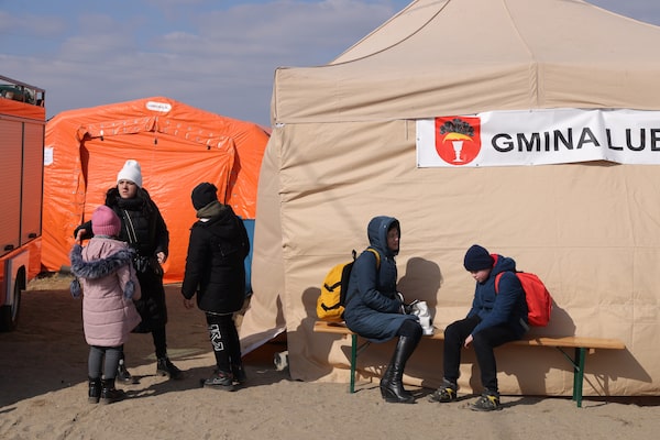 Women and children who said they fled this morning from nearby Yavoriv in Ukraine arrive at an aid stage for refugees at the Budomierz border crossing on March 13, 2022 in Budomierz, Poland.SeanGallup/Getty Images