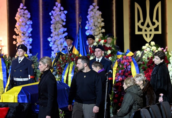 At the sombre service in Kyiv, Zelensky and his wife laid flowers on each of the seven coffins draped in the blue and yellow flags of Ukraine. Zelensky then spoke briefly with the families, as a small orchestra played a mournful adagio.