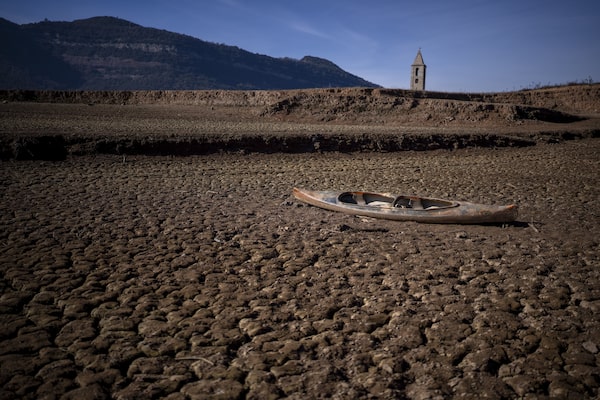 An abandoned canoe sits on the cracked ground amid a drought at the Sau reservoir, north of Barcelona, Spain, Monday, Jan. 22, 2024.Emilio Morenatti/The Associated Press