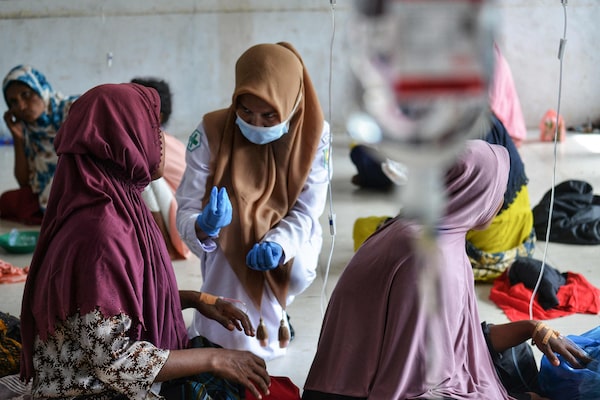 A health worker assists Rohingya refugees at a temporary shelter following their arrival by a boat in Laweung, Aceh province, on Dec. 27.CHAIDEER MAHYUDDIN/AFP/Getty Images