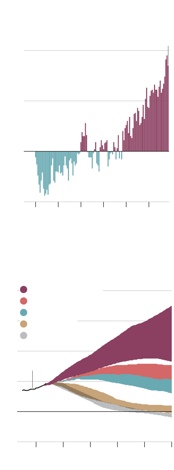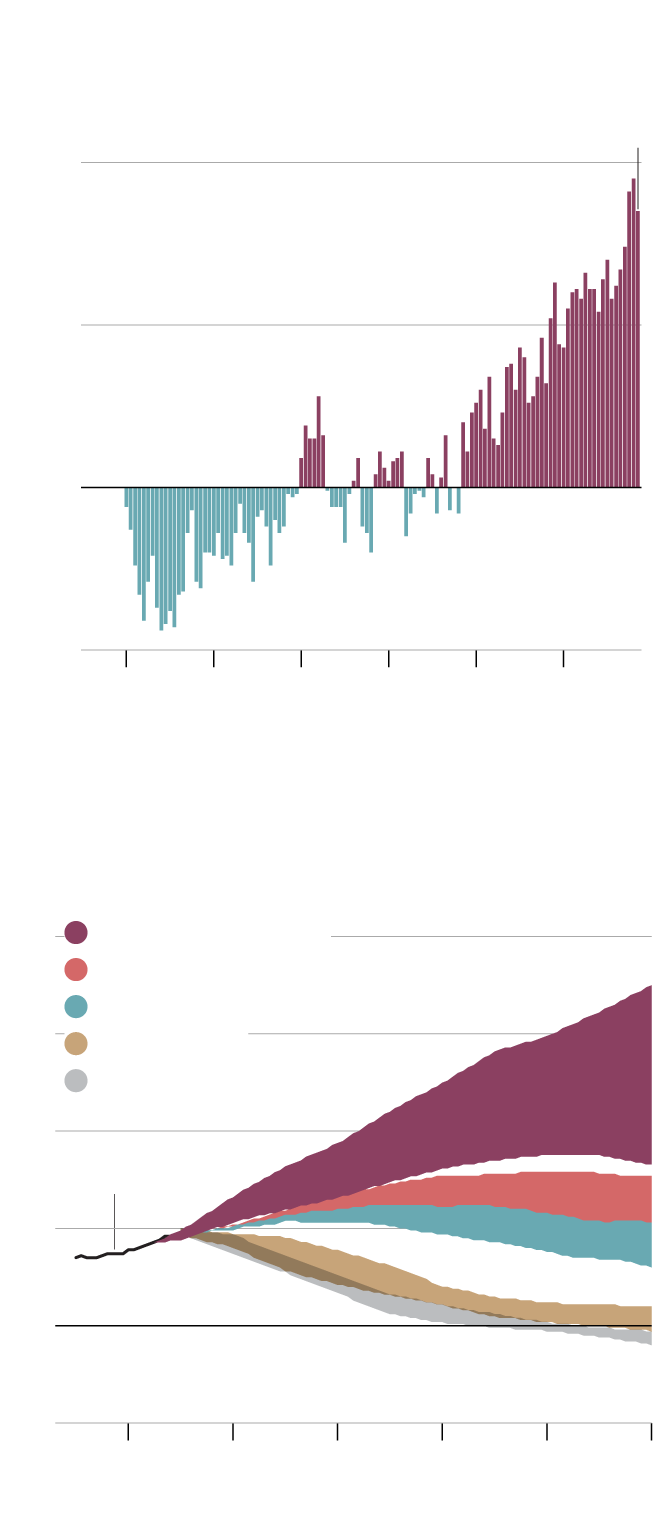 Projected emissions ranges, in gigatonnes of CO2 equivalent, for scenarios measured in degrees celsius above pre-industrial levels