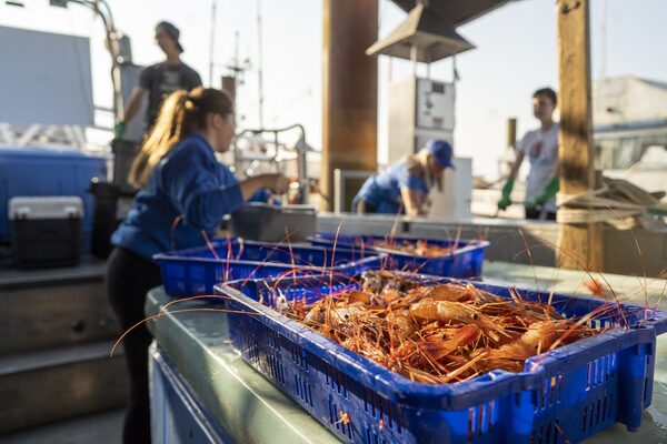 A basket of live spot prawns sits on a boat docked to the Steveston Fisherman’s Wharf in Richmond, B.C., as they wait to be weighed, on May 17, 2023.Kayla Isomura/The Globe and Mail