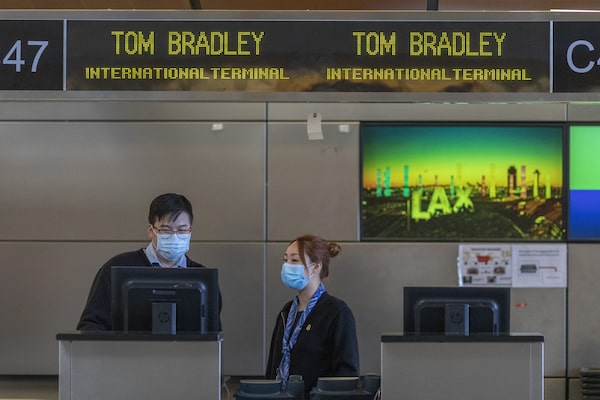 Air China employees wear medical masks for protection against the novel coronavirus outbreak at LAX Tom Bradley International Terminal on February 2, 2020 in Los Angeles.David McNew/Getty Images