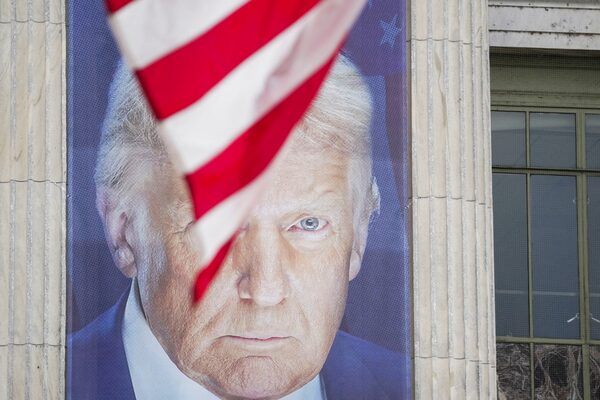 An American flag flies in front of a photo of U.S. President Donald Trump ahead of a military parade commemorating the U.S. Army's 250th anniversary in Washington, D.C. on Saturday.Nathan Howard/Reuters