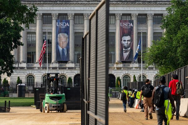 Banners of President Donald Trump and former President Abraham Lincoln on display at the U.S. Department of Agriculture as people pass through security fencing ahead of the parade. The celebration coincides with President Donald Trump’s 79th birthday.ERIC LEE/The New York Times News Service