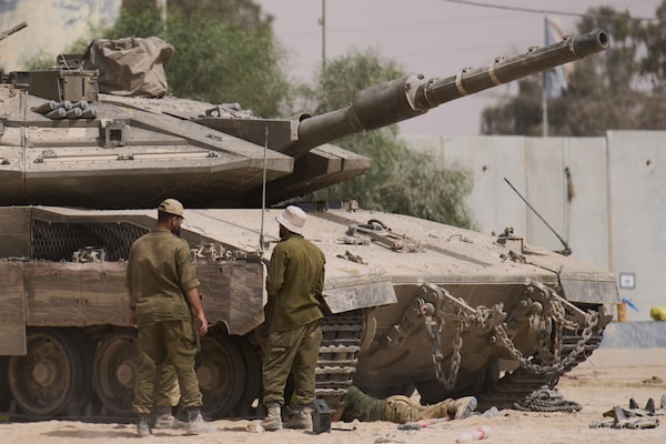 Israeli soldiers work on a tank at a staging area near the border with the Gaza Strip on Tuesday.Ariel Schalit/The Associated Press