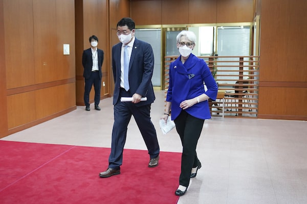U.S. Deputy Secretary of State Wendy Sherman, right, walks with South Korean First Vice Foreign Minister Choi Jong Kun after their meeting at the Foreign Ministry in Seoul, South Korea.The Associated Press