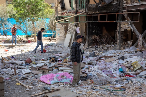 People view debris from a damaged residential building that, according to Iranian authorities, was hit by a strike on March 4, in Tehran on Tuesday.Majid Saeedi/Getty Images
